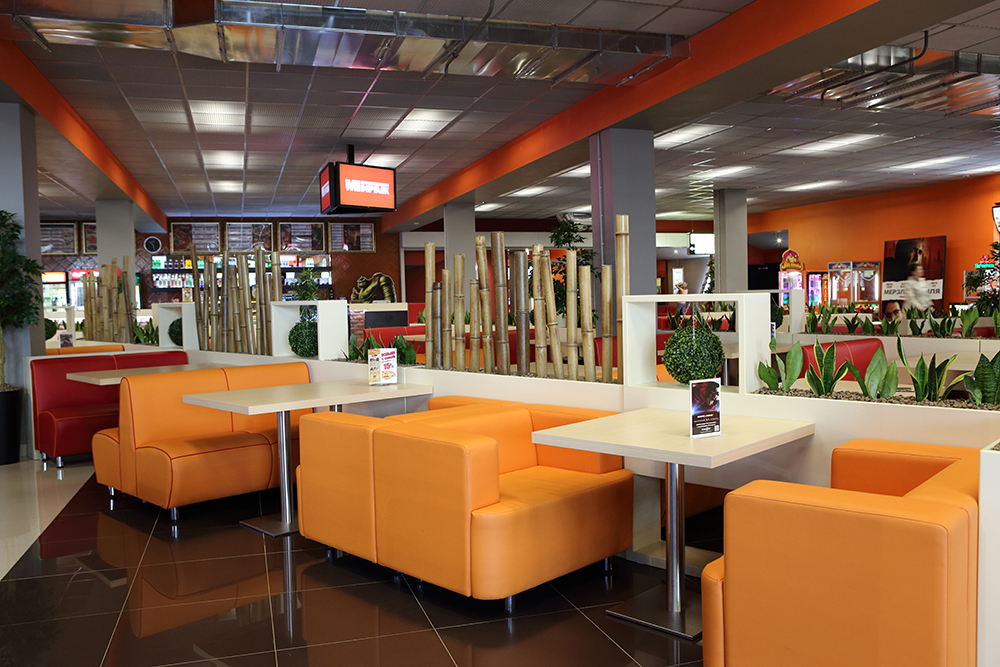 В фойе кинотеатра расположилась зона кафе «Pure», где официанты всегда готовы принять ваш заказ и помочь выбрать наиболее подходящие вашему настроению блюдо или напиток. Также в фойе имеется небольшая VIP-зона со столиками.